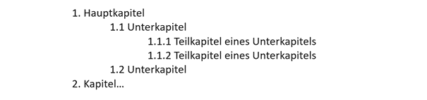Hauptkapitel sind dabei immer die wesentlichen Bestandteile einer Dokumentation und haben immer eine neue Nummer. Bspw. «1. Inhaltsverzeichnis», «2. Einleitung», «3. Hauptteil» etc…