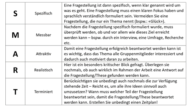 Es ist nicht immer einfach eine wirklich gute Fragestellung zu einem Thema zu finden. Die SMART-Methode kann dabei helfen zu überprüfen, ob eine Fragestellung wirklich sinnvoll für den gewünschten Rahmen ist.